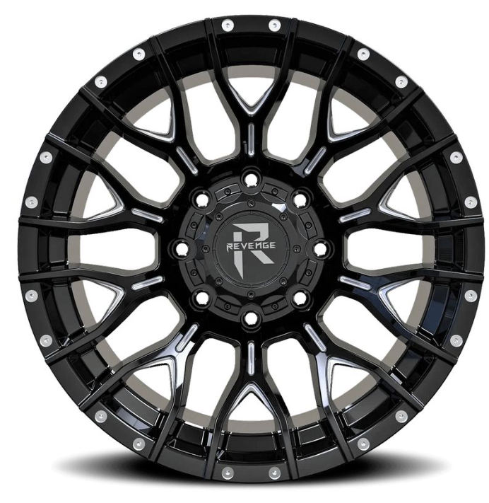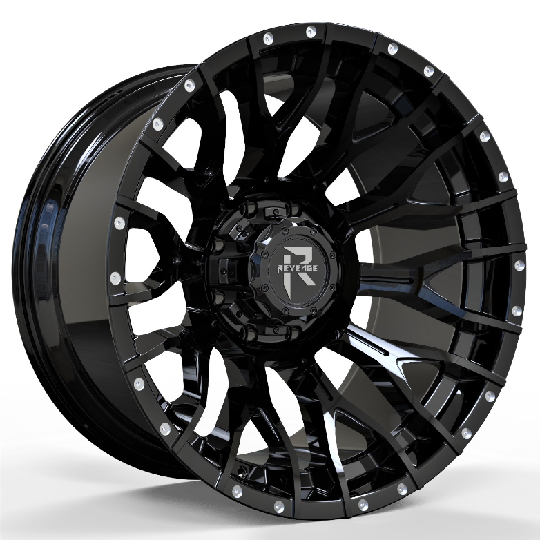 Revenge Offroad RV-201 is a rugged, high-performance one-piece cast aluminum wheel, perfect for truck and SUV enthusiasts seeking a clean, deep-black aesthetic with subtle aggressive details. This specific model features a brilliant Gloss Black finish complemented by simulated hardware accents (often referred to as “Dots” or “Rivets”) along the deep lip, giving it a commanding, off-road inspired look. Sized at 20×9 with a 0mm offset, it delivers a powerful stance that pushes the wheel out for enhanced stability and curb appeal. The dual 5×127 and 5×139.7 bolt pattern ensures compatibility with a wide range of popular 5-lug off-road vehicles.
