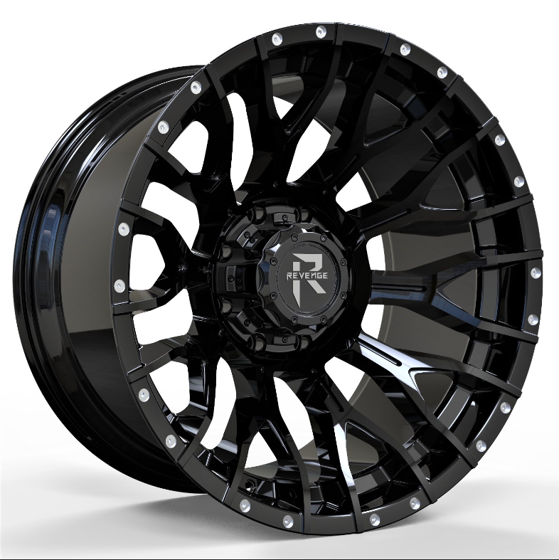 Revenge Offroad RV-201 wheel in Gloss Black with Dots delivers a sharp, clean, and aggressive look perfectly suited for modern 6-lug trucks and SUVs. This 20×9, 10-spoke wheel features a brilliant, deep black finish that shines on the road, contrasted by simulated rivets (“Dots”) lining the deep outer lip to create an imposing, beadlock-inspired aesthetic. With a 0mm offset, the wheel achieves a powerful stance, pushing it out for a wider track and a more customized appearance. This specific model’s dual 6×135 and 6×139.7 bolt pattern is engineered to fit the most popular 6-lug platforms, including the Ford F-150, Chevrolet Silverado, and Toyota Tundra/Tacoma.