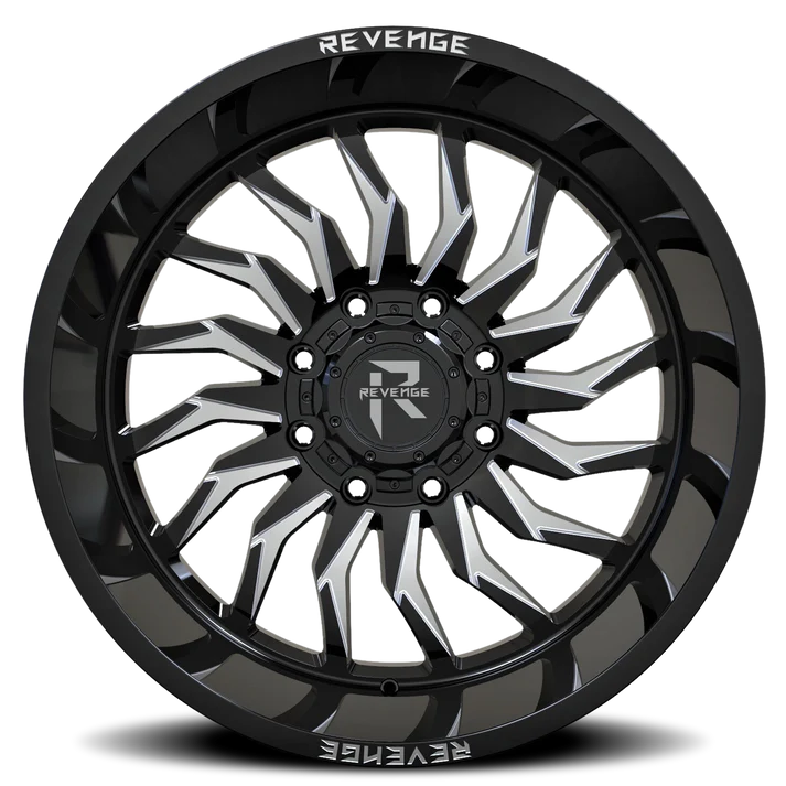 Revenge Off-Road RV-204 Black & Milled 20×10 –19. This rugged yet refined wheel boasts a gloss-black finish with machined/milled spokes, a –19 mm offset for an aggressive stance, and dual 6-lug bolt patterns (6×135 & 6×139.7) for versatile fitment. Built with cast aluminum, it supports a 2,500 lb load rating — combining durability and style for both on-road and off-road driving.